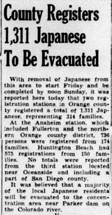 “Three civilian exclusion orders which will evacuate Japanese and enemy aliens from Orange county and a small section of northern San Diego county were issued late Saturday by Lieut Gen. J.L. DeWitt,” the News-Tribune reported. “This order will mean that all Japanese still remaining in Fullerton and Orange county areas will be evacuated by next Sunday noon.”