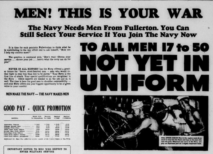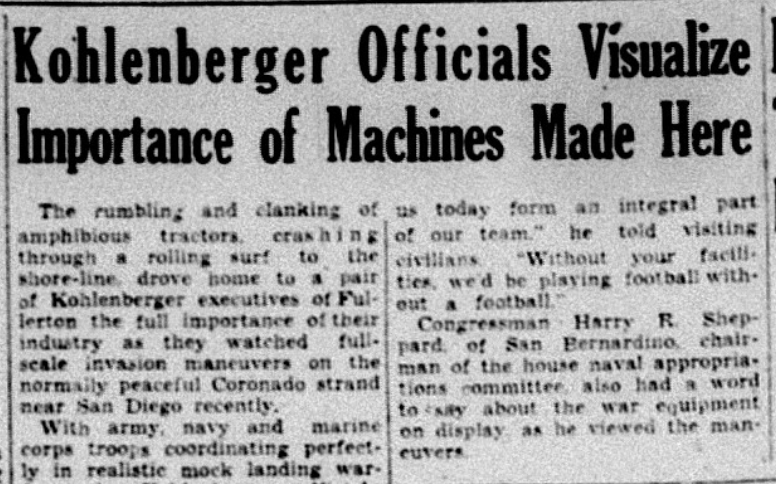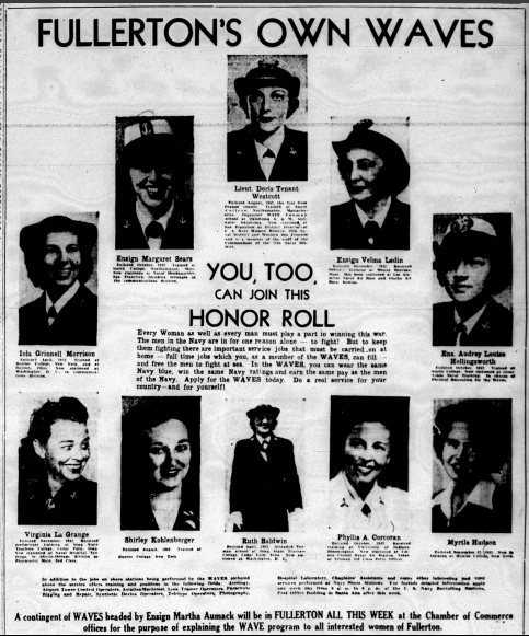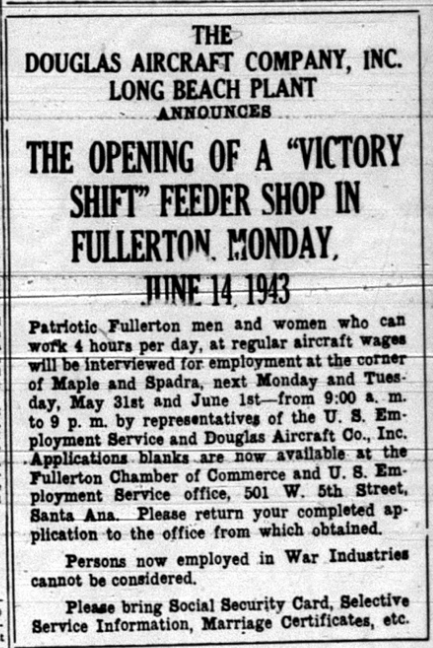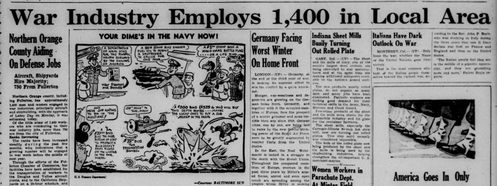 “Northern Orange county, including Fullerton, has approximately 1.400 men and women engaged in war industries, principally aircraft and shipbuilding,” the News-Tribune reported. “Of the little army of 1,400 workers who are commuting to their war industry jobs, more than 750 are from the city of Fullerton.”