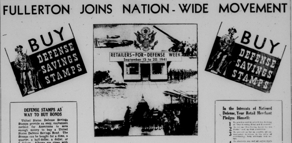 “Many tears rolled down the cheeks of proud mothers and fathers who saw their sons and other relatives off to induction stations,” the News-Tribune reported in 1942. “Fullerton citizens quickly adjusted themselves to the war…every phase of Civilian Defense was organized quickly here…Red Cross activities boomed…War bonds sales went over with a smashing success, the quota being topped every month in Fullerton…Tire rationing, food stamp, auto use stamp and other new regulations brought on by the war were met without confusion here…’Let’s Knock Out the Axis’ seemed to be the the theme of the city’s efforts throughout the year.”