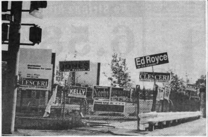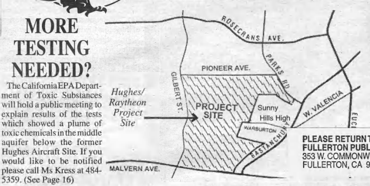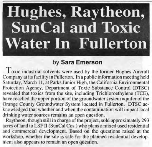 Perhaps the biggest local story, at least in the pages of the Fullerton Observer, was the presence of toxic industrial pollution on the site of the large former Hughes Aircraft facility in west Fullerton, which had closed down in 1994. The owners, including Raytheon, were seeking to convert much of the land into a large housing and commercial development plus an elementary school. Today, that development is called Amerige Heights.