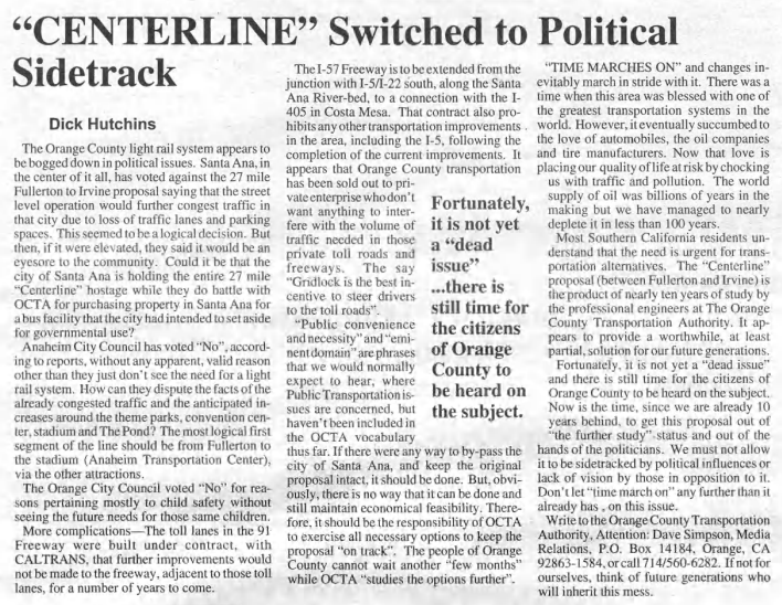 “Critics of a light rail system insist that it is a waste of time and money on a technology that no one will use. The proof that they are ignoring facts is reflected in the continued increase in ridership on the Metro-Link trains,” the Observer reported. “Also ignored is the fact Orange County) already have mass transit systems in operation and are reporting them to be successful. Whether or not the critics (lovers of freeways) want to admit it, support for an Orange County mass transit system is overwhelming. People just do not want to continue building more freeways (or toll roads).”