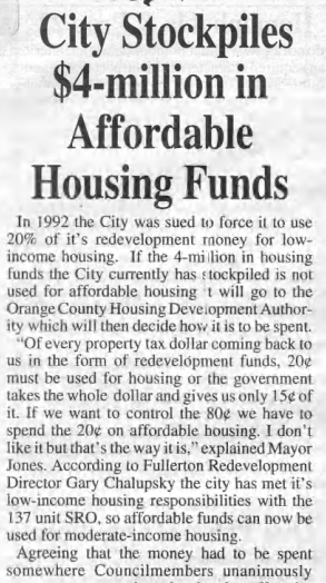 Throughout the 1980s and 1990s, Fullerton’s conservative/Republican City Council majorities were generally opposed to building affordable housing projects, even (or perhaps especially) when the money came from the federal government.