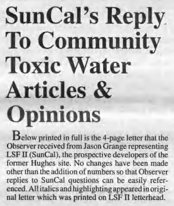 “Clearly the Observer has an agenda,” the developer’s lawyers chided, “That agenda is to disparage Hughes, Raytheon, LSF II Fullerton, LLC and those involved in the environmental remediation process taking place at the Hughes Raytheon site.”