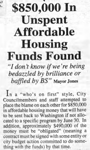 “City Councilmembers and staff attempted to place the blame on each other for $850,000 in affordable housing money that will have to be sent back to Washington if not allocated to a specific program by June 30,” the Observer reported.