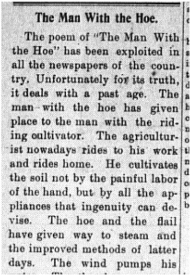 As the 19th century drew to a close, the Industrial Revolution was spreading to agriculture, pushing out the small farmer in favor of large, corporate farming companies and ranchers. At this time, there was a famous poem called “The Man With the Hoe,” which was a kind of elegy to the small farmer. Edgar Johnson thought it was a bullshit poem, preferring to celebrate modern advancements in farming. In an editorial, he wrote: “The poem of ‘The Man With the Hoe’ has been exploited in all the newspapers of the country. Unfortunately for its truth, it deals with a past age. The man with the hoe has given place to the man with the riding cultivator. The agriculturalist nowadays rides to his work and rides home. He cultivates the soil not by the painful labor of the hand, but by all the appliances that ingenuity can devise. The hoe and the flail have given way to steam and the improved methods of latter days.”