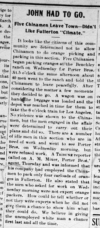 The Fullerton Tribune newspaper featured a running trend of articles dealing with the topic of Chinese Exclusion, all of which heartily supported it.