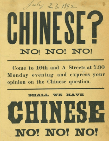 Anti-Chinese clubs sprang up around California starting in the 1860s. Cities like San Francisco passed discriminatory ordinances making it illegal to carry baskets on the sidewalks or for men to grow their hair a certain length. Chinese people were routinely harassed and expelled from their homes and places of work.