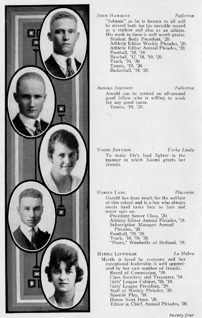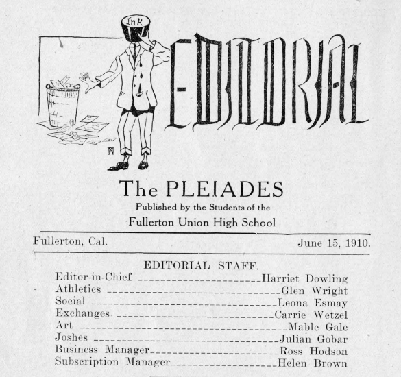 Lately I’ve been writing a series of posts on the history of Fullerton Union High School. As part of this research, I’ve been looking through the digital archives of the annual FUHS yearbook, called Pleiades, which are available on the Fullerton Public Library web site.