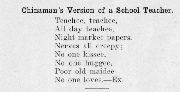 Lest we get feeling too nostalgic about this, this issue of the Pleiades includes a racist anti-Chinese joke and poem: