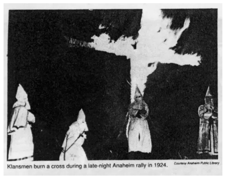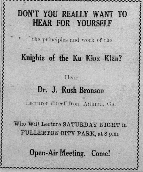 The following is an excerpt from an interview for the Fullerton Community History Project with former Fullerton resident Margaret O’Hanlon. The interview was conducted and recorded by Anne Riley in 1971. Margaret’s husband, Dan O’Hanlon, was a prominent figure in early Fullerton. He was a charter member of the Kiwanis Club, the Elks club, the first president of the Fullerton Realty Board, and an insurance agent. Margaret recalls a conflict between her husband and the Ku Klux Klan in Fullerton in 1923: