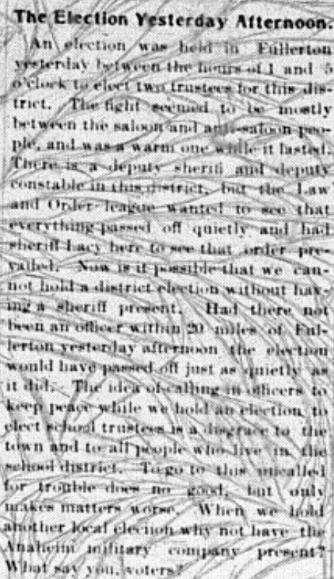 An election was held in Fullerton yesterday between the hours of 1 and 5 o’clock to elect two trustees for this district. The fight seemed to be mostly between the saloon and anti-saloon people, and was a warm one while it lasted. There is a deputy sheriff and deputy constable in this district, but the Law and Order league wanted to see that everything passed off quietly and had Sheriff Lacy here to see that order prevailed. Now is it possible that we cannot hold a district election without a sheriff present. Had there not been an officer within 20 miles of Fullerton yesterday afternoon the election would have passed off just as quietly as it did. The idea of calling in officers to keep peace while we hold an election to select school trustees is is a disgrace to the town and to all people who live in the school district. To go to this uncalled for trouble does no good, but only makes matters worse. When we hold another local election why not have the Anaheim military company present? What say you, voters?