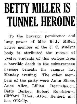 To the bravery, persistence, and lung power of Miss Betty Miller, active member of the J. C. student body is attributed the rescue of twelve students of this college from a horrible death in the subterranean passage beneath the campus last Monday evening. The other members of the party were Anita Stone, Anne Allen, Lillian Hezmalhalch, Betty Berkey, Robert Rundstrum, Clifford Taber, Afton Reinert, and Lee O’Kelly.