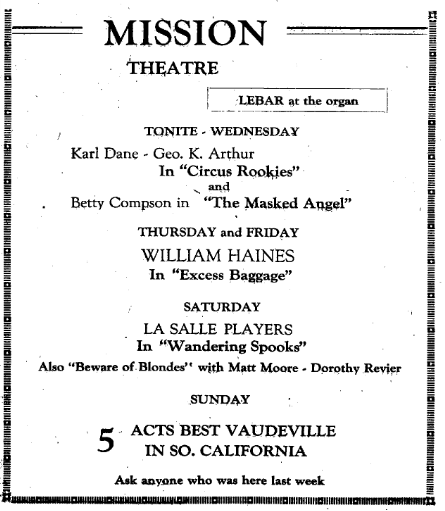 Chapman’s Alician Court Theater was built in 1925 by C. Stanley Chapman, son of Fullerton’s first mayor Charles C. Chapman, and it went through many name changes over the years, including the Mission Court Theater, before it became the Fox Theater, which is currently being restored by the Fox Theater Foundation. This new Hollywood style movie palace was a popular spot for college kids, and so the theater advertised in the local college newspaper. This is a cool window into when theaters like this included both motion pictures and live vaudeville shows.