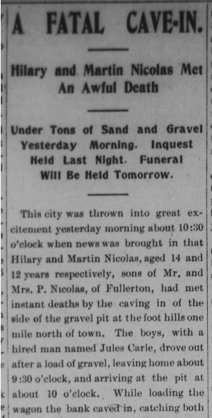 Two sons of Pierre Nicolas, an early rancher in Fullerton, died tragically in a gravel pit cave-in.