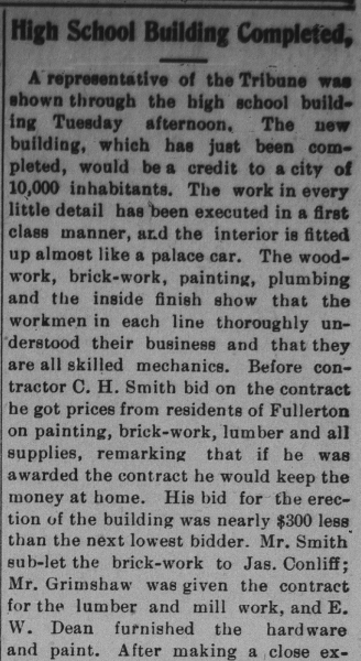Fullerton’s first high school building was completed in 1899. The high school would move to a new building in 1910, which would burn down about a year after it was built. To learn more about the history of Fullerton High School, read my summary of Louis Plummer’s history.