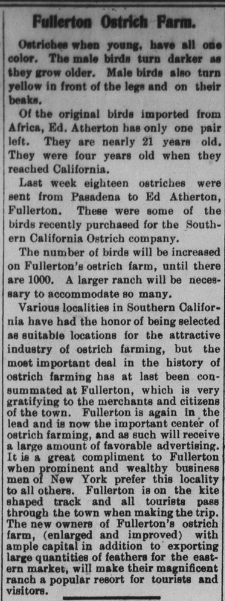 Fullerton’s ostrich farm, which was started by Edward Atherton, was sold to new owners; however, Atherton stayed on as manager.