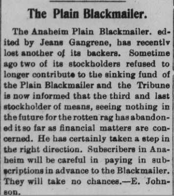 There were two newspapers in Anaheim–the Gazette and the Plain Dealer. Apparently, Tribune editor Edgar Johnson took issue with the Plain Dealer.