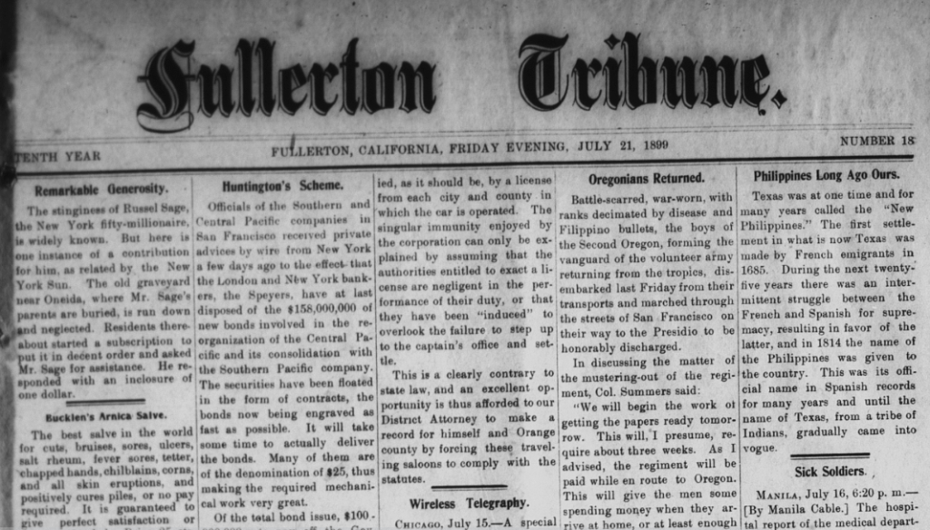 The Local History Room of the Fullerton Public Library has microfilm from the Fullerton Tribune newspaper stretching back to 1893. I am in the process of skimming over the microfilm, year by year, to get a sense of what was happening in the town over the years. Here are some local headlines from the year 1899.