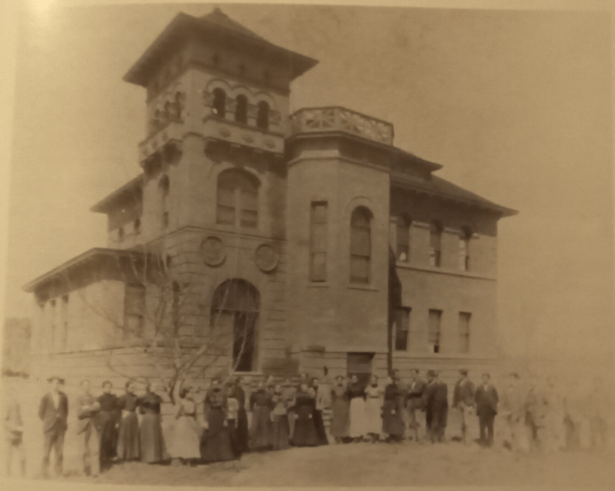 Below, faculty and students stand outside Fullerton’s first high school building at the northwest corner of Wilshire and Lawrence avenues. When the new high school was built, this building was used by the elementary school district. It was torn down in 1913.