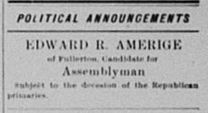 Town co-founder Edward R. Amerige, a Republican, was elected to the California State Assembly. He would serve two terms.