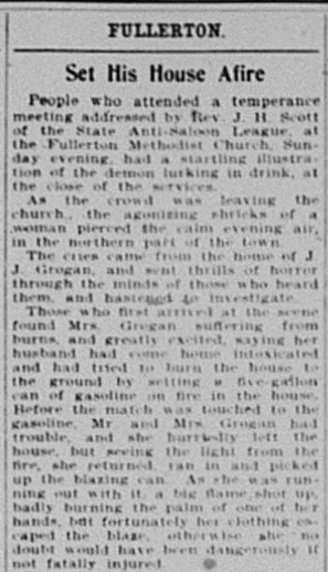 Perhaps adding some fuel to the fire of the liquor question occurred when attendees of a temperance meeting of the State Anti-Saloon League at the Fullerton Methodist church were interrupted by screams. Apparently, a Mr. J.J. Grogan had returned home intoxicated and attempted to burn down his house. See clipping below…