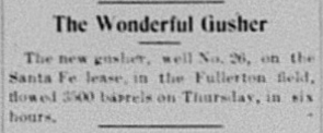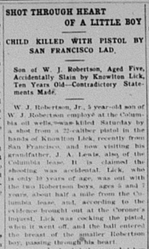 In the oil fields north of Fullerton, a tragedy occurred when a 10-year old boy named Knowlton Lick accidentally shot a 5-year old boy named W.J. Robertson.