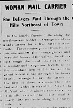 There was a female mail carrier named Cora Vail who served the rural route through the hills north of Fullerton.