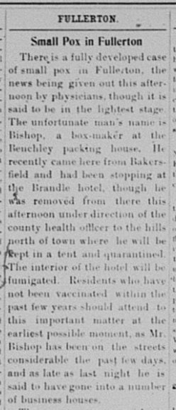 Diseases like smallpox were a concern, and the Tribune tells of a few cases in Fullerton, even though a vaccine existed. When patients were discovered to have smallpox they had to go quarantine themselves in a tent in the hills north of town until they recovered. Alternatively, they could have just gotten vaccinated.