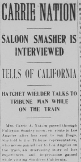 Famous prohibitionist Carrie Nation passed through Fullerton and was interviewed by Tribune editor Edgar Johnson.