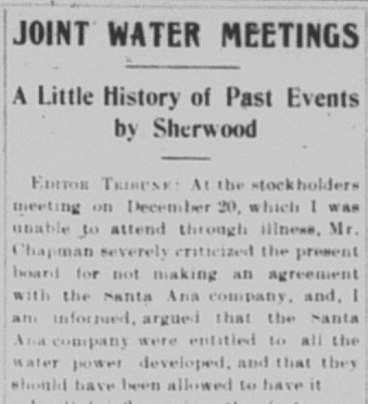 The main local water entity in 1903 was the Anaheim Union Water Company (AUWC). They had water rights to (some of) the Santa Ana River, and shared these rights with other companies like the Santa Ana Valley Irrigation Company. These were private companies whose Board of Directors tended to be owners of large, local ranches. Water rights (also called riparian rights) were a really big deal—water is life, and profits for farmers. Around 1901, these two water companies met together to bring legal action against a Mr. Fuller, “the Riverside county land-grabber” to prevent his taking water from the Santa Ana River. This would be one of many ongoing legal battles over local water rights.