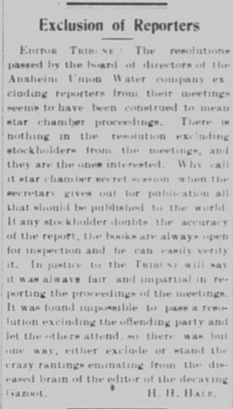 Meanwhile, the Anaheim Union Water Company and the Santa Ana Valley Irrigation Company cut a deal to share water rights. Mr. Sherwood, a sometimes Board Member who liked to write lengthy articles in the Tribune criticizing the AUWC, took issue with the deal. To which Samuel Armor of the Santa Ana Valley Irrigation Company replied: “G.W. Sherwood seems to be afflicted with a diarrhea of words accompanied by a costiveness of ideas. For two years or more he has been filling the papers west of the river with misrepresentations and insinuations against the S.A.V.I. Co. until his followers have come to believe the the people on this side are equipped with hoofs and horns and forked tails.” To which Sherwood replied: “I have always taken pleasure in setting Armor right, when he gets tangled up in the mazes of his own alleged erudition…With regard to the proposed division of water, Armor’s premises are false and his conclusions are wrong.”
