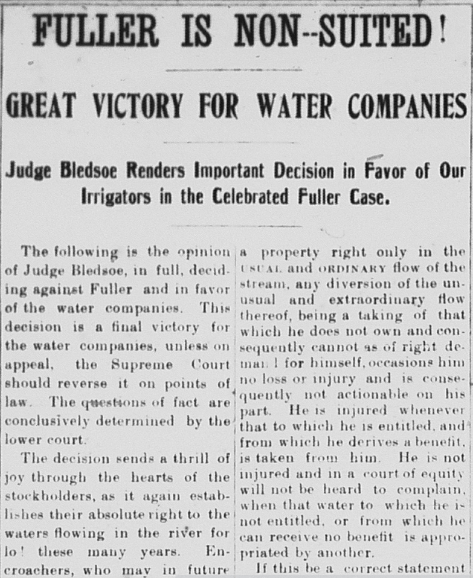 Meanwhile, Fuller, the “Riverside land-grabber” lost in court. An article gleefully proclaiming FULLER IS NON-SUITED! stated: “The decision sends a thrill of joy through the hearts of the stockholders, as it again establishes their absolute right to the waters flowing in the [Santa Ana] River for lo! these many years. Encroachers, who may in the future attempt to divert the water from its natural course, will please take warning. The decision further cements our rights to the life-giving fluid.”