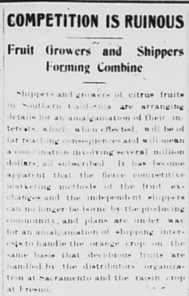 Scope of work to be undertaken by the new organization, if it reaches final accomplishment, assumes to control marketing from the packing house to the jobber, eliminates various organization expenses, and stops the ruinous cutting of prices by competitive selling…Names of all the leading fruit shipping houses as well as the fruit exchanges collectively and separately have been definitely connected with the deal and its consummation may be looked for in the next few days.