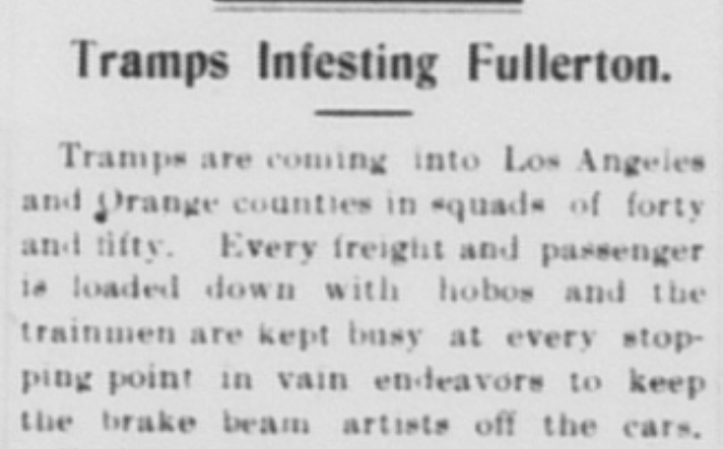 Anaheim is not alone in being bothered by these wanderers. They abound in Fullerton and vicinity in almost as great an extent as in Anaheim. The experience with some of those arrested in the town down the road is evidence that these tramps are not only an obnoxious but in some cases a dangerous element in the country.