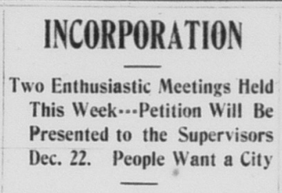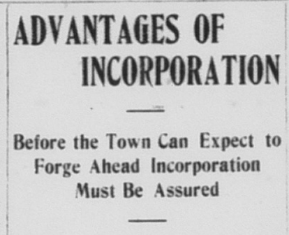 A major local issue in 1903 was the question of incorporating the town, which would allow it to have its own government and taxation powers. Tribune editor Edgar Johnson wrote some editorials in favor of incorporation.