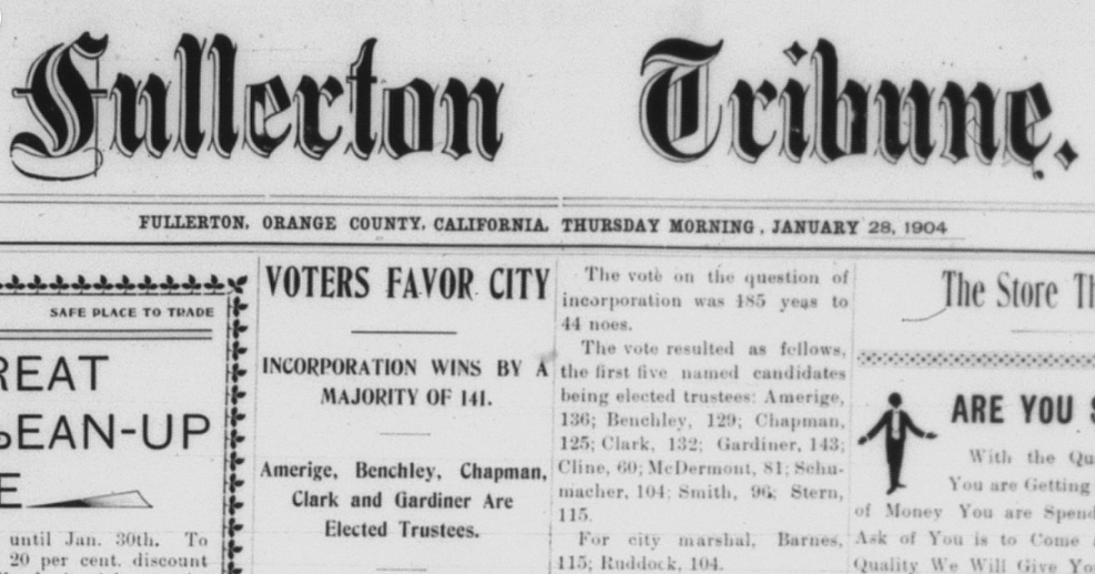 Perhaps the most significant event of 1904 was incorporation. Residents voted to establish Fullerton as a city, complete with a Board of Trustees and taxation powers. The first Board of Trustees (now called City Council) was Edward Amerige, E.K. Benchley, Charles Chapman, George Clark, and John Gardiner.
