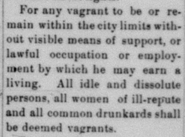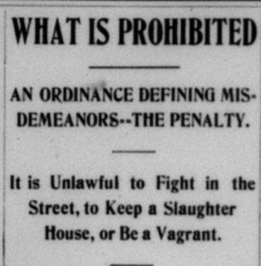 They also passed ordinances prohibiting some things in town, most of which make sense–no fighting in the streets, etc. But some of the town prohibitions seem quite harsh, such as bans on vagrancy and cross-dressing.