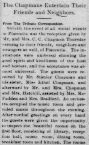 Strictly the event of all social events in Placentia was the reception given by Mr. and Mrs. C.C. Chapman Thursday evening to their friends, neighbors, and strangers as well, of Placentia. The invitations were universal showing the good spirit and kindliness of the host and hostess, and the acceptance was almost universal. The guests were received by Mr. Stanley Chapman and his sister, Miss Ethel Chapman, and afterward by Mr. and Mrs. Chapman and Mrs. Hatchill, assisted by Mrs. McFadden and Mrs. Bradford. An orchestra occupied the music room and provided music throughout the evening. After cordial greetings on every hand the guests were given the opportunity to inspect the beautiful rooms on the first floor, consisting of library, reception hall, music room, dining room, breakfast room and kitchen. The rooms on the second floor were then shown. The guests were then invited to the third story which proved to be a hall strictly in keepinig with the rest of the house. Here the guests were seated and most thoroughly enjoyed an entertainment.