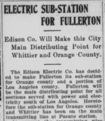 The Edison Co. built an electric sub-station in Fullerton that made the town the main distributing point for Whittier and Orange County.