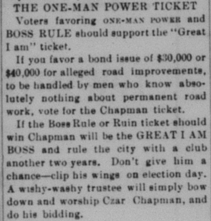 This was in contrast to what Johnson called “The One-Man Power Ticket.” That one man was Charles C. Chapman, whom Johnson had taken to calling the town “Czar” and “The Great I Am.”