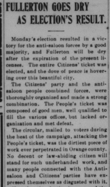 In 1904, the year Fullerton incorporated, the town’s residents (who were quite divided over whether to prohibit saloons), voted to allow them. Two years later, in 1906, the town voted to outlaw them.