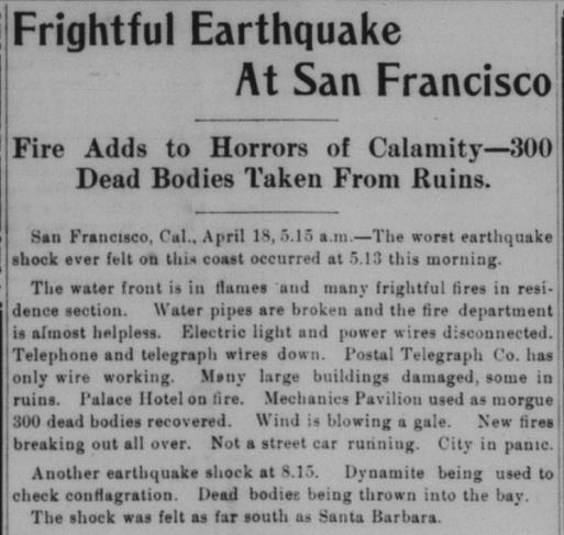 1906 was the year of the great San Francisco earthquake. More than 3,000 people died, and over 80% of the city was destroyed. The event is remembered as the deadliest earthquake in the history of the United States.