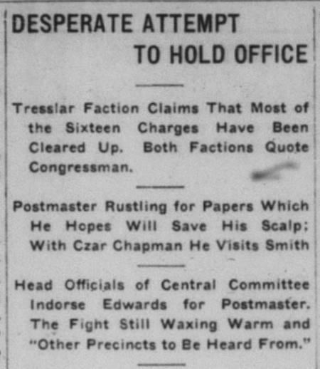 Interestingly, the town postmaster Vivian Tresslar, who was also the man Chapman hired to edit the Fullerton News, was in hot water for alleged legal violations.