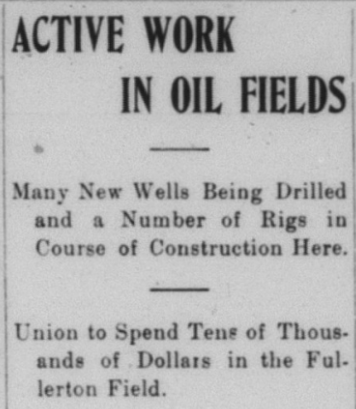 Although it’s not very evident today, Fullerton at the turn of the century was a very oil-rich region, and numerous wells were being drilled in the hills north of town.