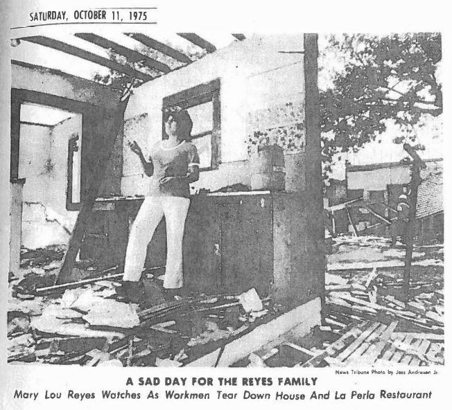A 1975 Fullerton News Tribune article entitled “Progress Uproots a Family” stated that the city of Fullerton used eminent domain to condemn the site of La Perla and the Reyes house, along with other neighbors “to make way for an underpass on Lemon Street at the railroad tracks.”