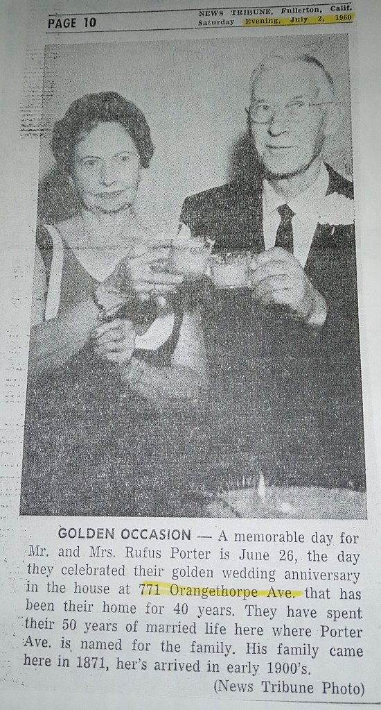 The Porter’s first house was located on a 40-acre farm on what is now the 600 block of W. Orangethorpe.