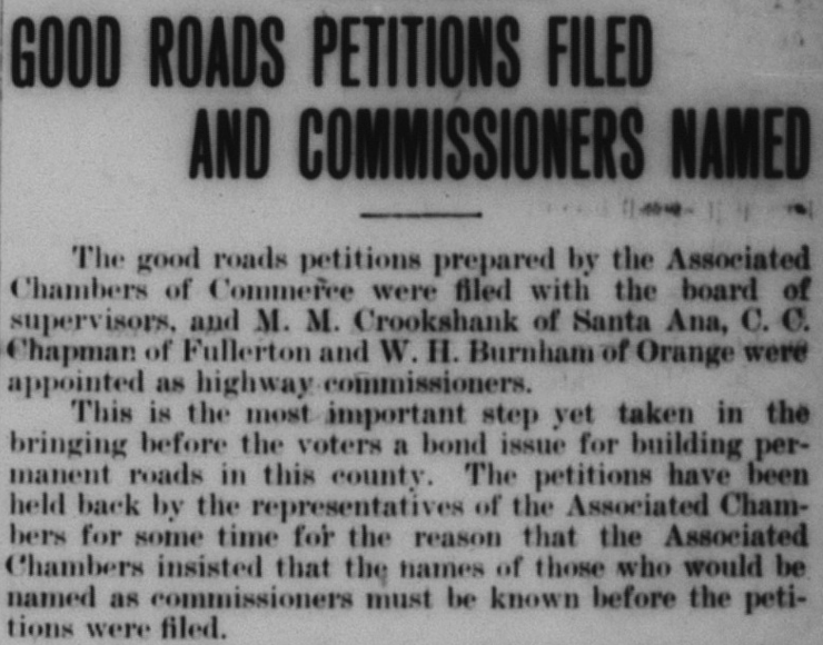 A perennial local issue has been investment (or lack thereof) in the improvement of roads. In 1910, there was a regional movement, sponsored largely by the Associated Chambers of Commerce, to get voters to approve bonds for improved county roads. This issue would be debated in the pages of the Tribune and other local papers.