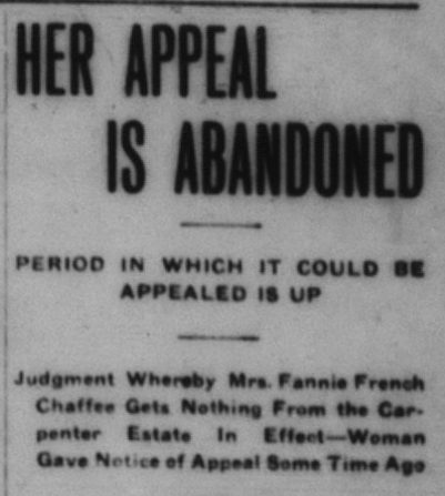 Another scandal involved the former high school principal W.R. Carpenter abandoning his wife and marrying the widow of the Baptist minister, Fannie French-Chaffee. Carpenter died shortly after the couple ran off, and Fannie sued Carpenter’s first wife for money she said she loaned to her deceased husband. The court denied her request.