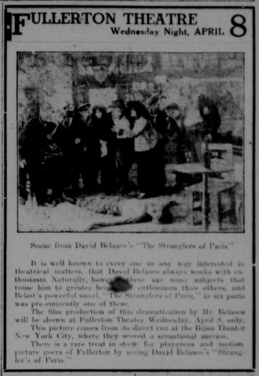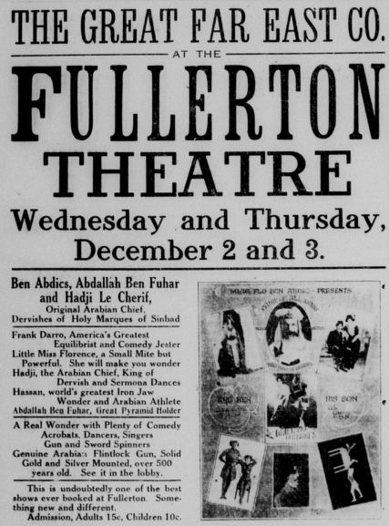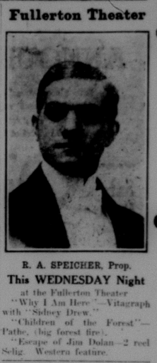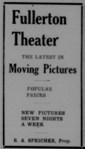 Before the Fox was built in 1925, Fullerton’s first movie theater was called the Fullerton Theater, and later the Rialto Theater. It was located at 219 N. Spadra (Harbor Blvd). The proprietor was R.A. Speicher. Here are some ads for shows at the theater: