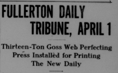 In 1914, the weekly Orange County Tribune started printing the Fullerton Daily Tribune and got a new printing press to accomodate the increased circulation.